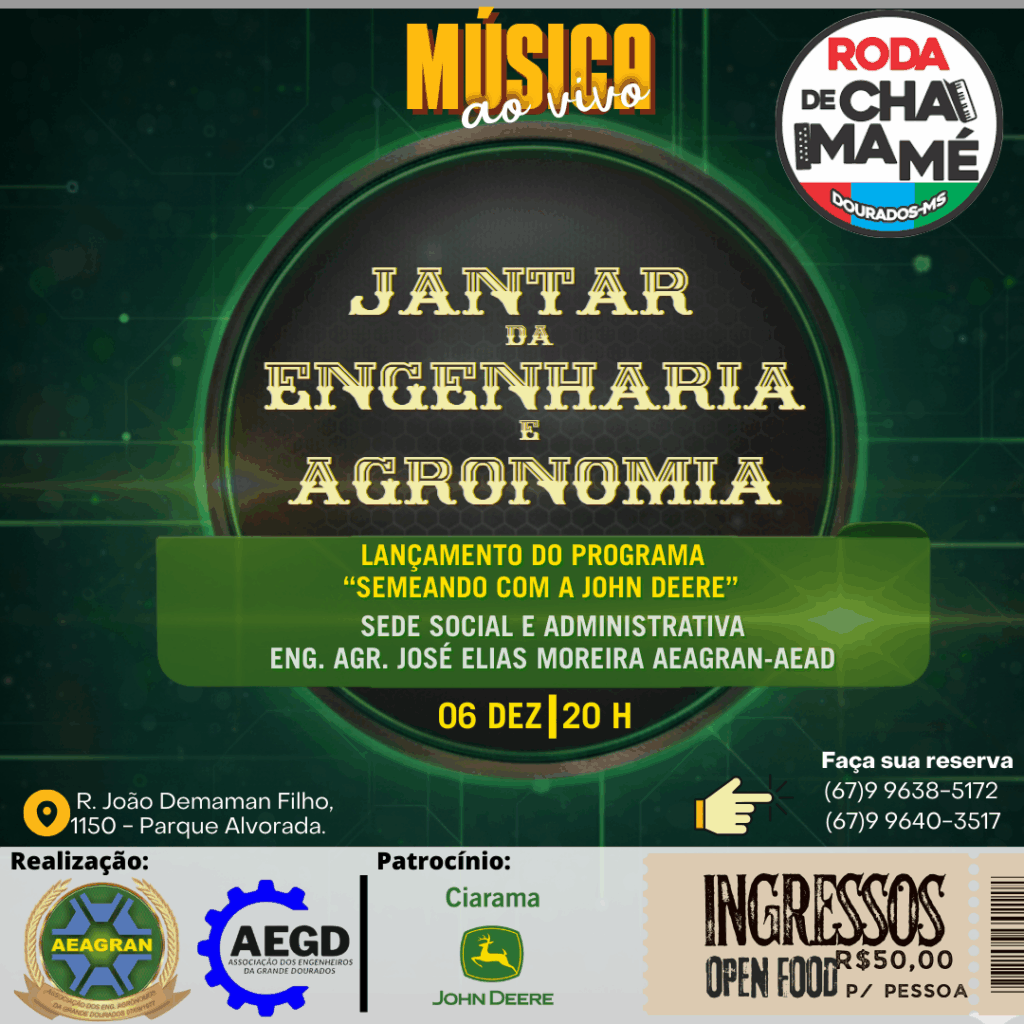 A Associação dos Engenheiros Agrônomos da Grande Dourados (AEAGRAN) e a Associação dos Engenheiros da Grande Dourados (AEGD) têm o prazer de convidar você para um evento especial: o Jantar da Engenharia e Agronomia!